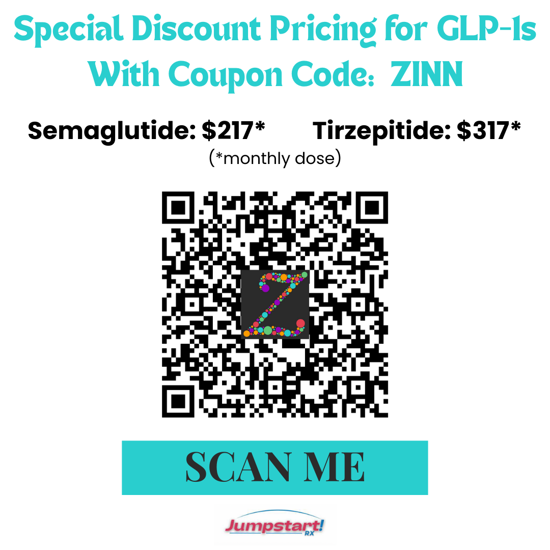 We are excited to join you to begin your weight loss journey. Zinn Insurance has partnered with JumpstartRSX to offer discounted semaglutide and tirzepitide prescription medication used to manage type 2 diabetes and for weight loss in adults. The process is simple: scan the QR code. Purchase your preferred medication, complete the health intake form to determine eligibility, and, once your prescription is approved, we will ship it directly to you.